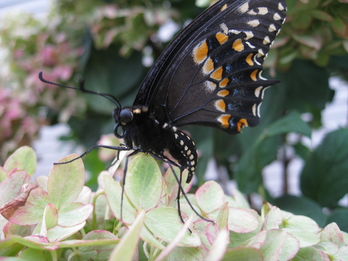 We saw Flopper in our yard and it was apparent he had a damaged wing from something. A bird or a praying mantis probably. He was able to fly, but not easily, flopping around. We have a butterfly garden, so he was hanging out in it.